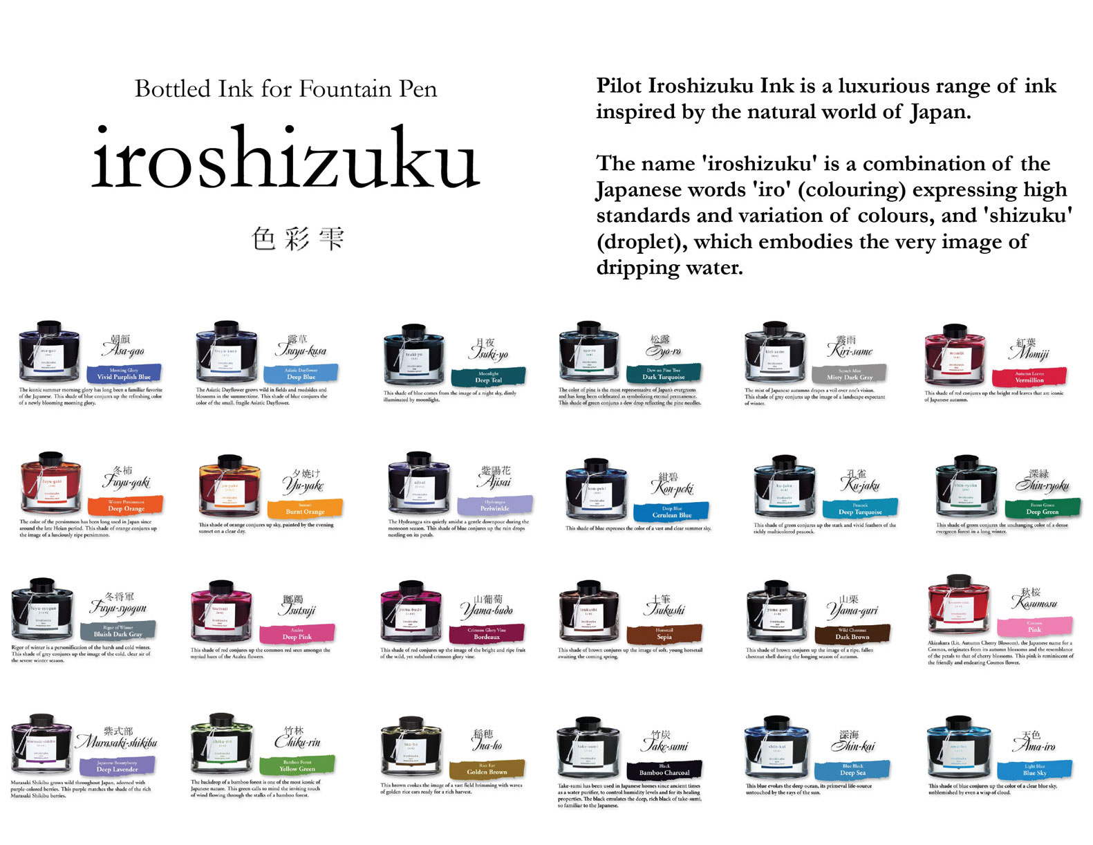 Each Iroshizuku bottled ink name derives from the expressions of beautiful Japanese natural landscapes and plants, all of which contribute to the depth of each individual hue.